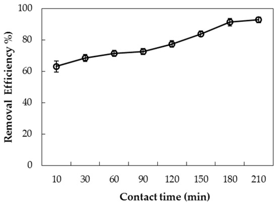 Contact time strongly induces to equilibrium of the adsorption process. The effect of contact time on the adsorptive removal of AMX using PDADMAC-modified nanosilica (PMS) is presented in Figure 12. As can be seen, removal of AMX increases with an increase of the contact time from 10 min to 180 min. After 180 min, removal changes insignificantly. This suggests that the adsorption reaches equilibrium at 180 min. Thus, 180 min is chosen for removal of AMX using PMS.