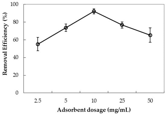 Figure 14 indicates that removal of AMX using PMS increases rapidly with increasing adsorbent dosage from 2.5 to 10 mg/mL. This may be explained by a large number of available binding sites for adsorption or an increased net specific surface area with increased dosage [56]. However, further increasing the adsorbent dosage over 10 mg/mL results in significantly decreased removal efficiency due to the very fast aggregation of silica particles at high adsorbent dosage [43,53]. The error bar showing the deviations of triplicates with 10 mg/mL is smaller than those of other dosages. Thus, optimum adsorbent dosage is found to be 10 mg/mL, and it is fixed for adsorptive removal studies.