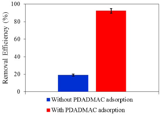 According to the results of PDADMAC adsorption on nanosilica (Section 3.2), the conditions to modify silica surface are 1% PDADMAC, pH 10, and 100 mM KCl. As a result, the surface charge of nanosilica is positive due to the presence of the polycation. Figure 15 shows that removal of AMX (at an initial concentration of 10 mg/L) in 1 mM KCl increases significantly from 19.1% to 92.3% after surface modification of nanosilica by PDADMAC. AMX adsorption onto bare nanosilica is highest at pH 11, at which low adsorption can be promoted by lateral interaction with the negatively-charged AMX. AMX adsorption onto PMS was significantly enhanced by electrostatic attraction between the negatively charged AMX and the positively charged PMS surface. This implies that PDADMAC-modified nanosilica rice husk can be used as a potential adsorbent more than bare nanosilica.