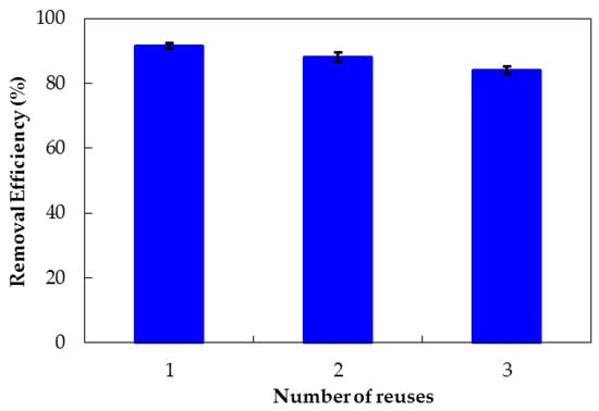 Although the silica synthesized from rice husk is a cheap adsorbent, the regeneration experiment is important to evaluate the stability and reuse potential of PMS. Thus, three sets of experiments were performed. The number of reuses in our case is quite small compared with L-phenylalanine methyl ester-imprinted polymer adsorption regeneration cycles [57], or 10 cycles of Pb2+ on alginate halloysite nanotube nanocomposite beads [58], but it is important to evaluate the economic and the environmental aspects of PMS for antibiotic removal. The AMX loaded onto PMS was released in 0.1 M KOH before being washed with ultrapure water for subsequent AMX adsorption experiments with the same conditions. Figure 16 shows that the efficiency of removing AMX with PMS after being reused three times decreased slightly. Removal efficiency was still greater than 83%. The decrease of removal efficiency is similar to the adsorption/desorption of arsenic on the material magnetic silica [59]. However, the removal efficiency is suitable for reuse PMS. This implies that PDADMAC is irreversibly attached to the nanosilica rice husk. In other words, PMS is a novel adsorbent in terms of economic and environmental aspects.
