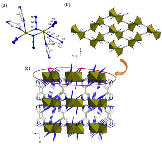 (a) The local coordination environment of Compound 2; (b) the 2D Cu2-pym layer; (c) the pillared-layer 3D structure of 1. The H atoms of the bpym ligand have been omitted for clarity.