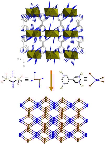Schematic representation of the (3,4)-connected tfi topologic network Compound 2; the EO- and EE-azides are represented by green; the bpym and Cu center are represented by blue and brown spheres, respectively.