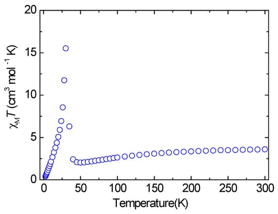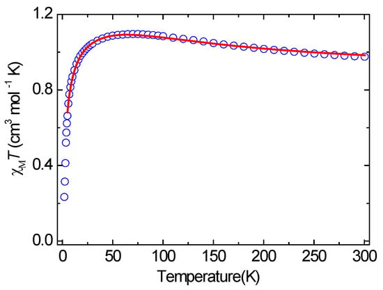 The temperature-dependent χMT for Compound 2 in the range of 2.0–300 K under a 1.0 kOe of applied field is shown in Figure 8. The χMT value at 300 K is 0.98 cm3 mol−1 K, which is higher than the expected value of 0.75 cm3 mol−1 K for an isolated Cu(II) ion (S = 1/2 and g = 2.0). The χMT value increases gradually with the decrease of temperature, reaching a smooth maximum of 1.10 cm3 mol−1 K at 90 K, indicating the existence of ferromagnetic interactions. The χM data above 100 K obey the Curie–Weiss law with a C = 0.93 cm3 mol−1 K and a θ = 15.79 K (Figure S6). The positive value of θ confirms that ferromagnetic coupling is dominant. Upon further cooling, the χMT value abruptly decreases to 0.23 cm3 mol−1 K at 2.0 K, implying overall antiferromagnetism in the low-temperature range. The Néel temperature (TN), as deduced from the maxima value of dχM/dT, was TN = 3.05 K. Considering the crystal structure, the analysis of the magnetic properties of 2 was carried out by using the structure as a square lattice of dimeric units (layer of dimmers). The expression of the magnetic susceptibility for the dinuclear moiety (χdimer) was deduced by an isotropic Heisenberg Hamiltonian: H = −JSCu1SCu2, where J is the magnetic interaction through the double EO-N3 bridges. The dinuclear units were presumed to have an effective spin that was associated with the following Equation (1):