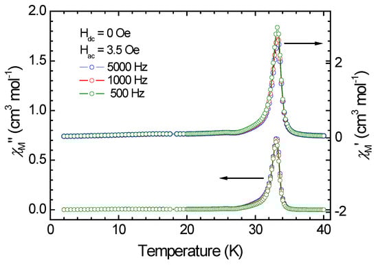 To investigate low-temperature magnetic behavior, zero-field-cooled (ZFC) and field-cooled (FC) magnetizations were performed for 1 at 10 Oe in the range of 2.0–40 K (Figure S5). Upon cooling, both ZFC and FC magnetization show an abrupt increase below 35 K and a divergence below 33.0 K, suggesting the occurrence of the formation of an ordered state and the existence of an uncompensated moment below the critical temperature (Tc) of 33.0 K. Indeed, the change in FC magnetizations at 31.0 and 18.0 K can be attributed to spin reorientation. The obtained results from the ZFC/FC magnetizations are compatible with measurements of alternating current (ac) magnetic susceptibility at different frequencies under Hdc = 0 Oe and Hac = 3.5 Oe (Figure 6). As can be seen in Figure 6, both in-phase (χM′) and out-of-phase (χM′′) signals exhibit maxima at ca. 33.0 K, and this maximum position is frequency-independent. This confirms the occurrence of magnetic ordering that is ferromagnetic-like due to spin canting, which is consistent with the ZFC/FC magnetization data. The observance of non-zero χM′′ signals below Tc is due to an uncompensated moment, and consequently, coercive behavior would be expected. It should be noted that the χM′ and χM′′ peaks are unsymmetrical in shape, with the low-temperature side showing some frequency dependence. This indicates the presence of a dynamic relaxation process [].