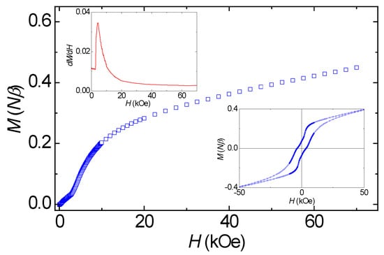 Field dependence of the magnetization of 2 at 2.0 K. The insets give the derivation of M vs. H and a blow-up of the hysteresis loop.