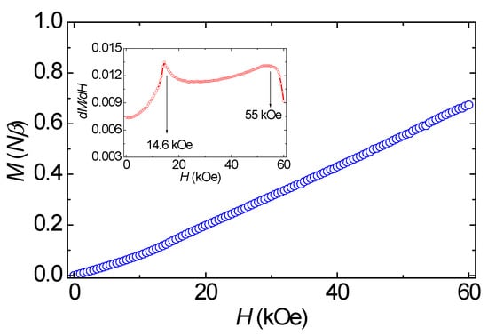 To study the low temperature magnetic behavior of Compound 2, zero ZFC/FC magnetizations down to 2.0 K were collected (Figure S7). The ZFC/FC magnetizations show a maximum at 3.1 K with the increase of temperature without any divergence indicating the existence of antiferromagnetic ordering below 3.1 K, which is consistent with the dc magnetic data. Antiferromagnetic ordering was confirmed by the ac magnetic susceptibility measurements, in which the χ′ signals increases with decreasing temperature and reach a maximum at 3.1 K without the presence of the χ″ signal (Figure S8). Isothermal magnetizations M(H) of 2 were performed at 2.0 K up to ±60 kOe (Figure 8), in which no hysteresis loop was observed. However, magnetization vs. field findings show interesting behavior; in the low field region (H < 15 kOe), the magnetization increases slowly, and after a steady increase, it turns linear until the field is about 60 kOe, where a second change, although a pronounced loss, is observed. Such magnetization behavior is an indication of a file-induced spin-flop (SF) magnetic transition, as has been reported for other antiferromagnets with a small degree of single-ion and/or exchange anisotropy []. For an SF transition, the antiparallel aligned spin “flops” to perpendicularity with the applied magnetic field. The spin-flop field (HSF) and critical field (HC) for 2 are found at ca. 14.6 and 55.0 kOe, respectively, as deduced from the peak position of dM/dH (Figure 9, inset). The M value of 0.67 Nβ at 60 kOe is less than the expected value of 1.0 Nβ for saturation that would be predicted for a Cu(II) ion (S = 1/2, g = 2.0). To further substantiate the existence of spin-flop, the field dependence of the ac magnetic susceptibilities, χM′(H), at 2.0 K was collected (Figure S8). The χM′(H) shows a sharp peak and a round maximum for the HSF and HC transitions, respectively, which is consistent with the results of dM/dH.
