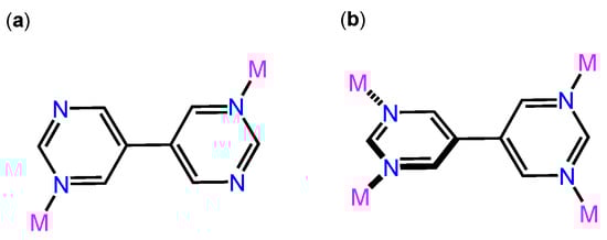 (a) The linear trans-μ2-N,N′-bpym in Compound 1; (b) the twisted μ4-N,N′,N′′,N′′′-bpym in Compound 2.