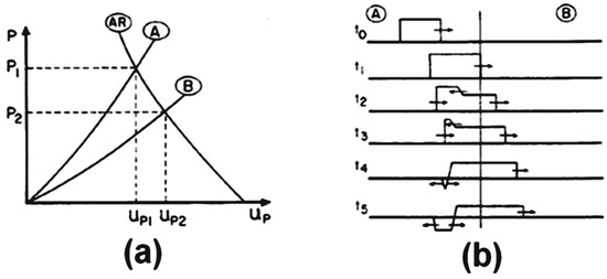 Transmission of shock wave from a medium with high to another with low density: (a) pressure-particle velocity plots; (b) stress profiles.