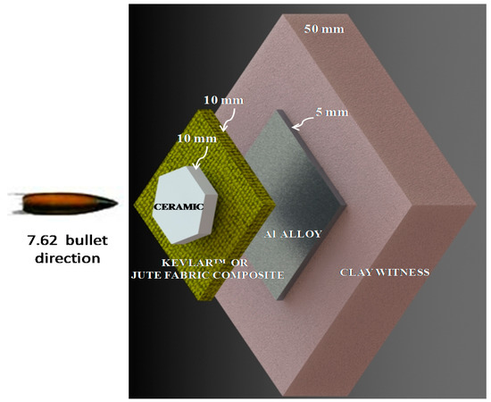 Based on the above-mentioned dynamic behavior of a MAS subjected to a ballistic impact, lighter material has been selected as the second layer. In particular, Kevlar™ and UHMWPE are nowadays common options. Analytical and material models were proposed to predict the ballistic efficiency of armors with Kevlar™ laminates [12] or UHMWPE filament-based composites [13]. However, less expensive natural materials could be used as MAS second layer. For instance, composites reinforced with natural lignocellulosic fibers are being extensively investigated as economical and sustainable alternatives [14,15,16,17,18,19,20,21] to replace synthetic fiber composites. Successful applications of natural fiber composites are taking place mainly in the automotive industry [22,23,24]. Another applied sector where natural composites are recently being investigated is ballistic armors [25,26,27,28,29,30,31,32,33,34]. Both natural fibers and fabrics reinforced polymer composites were found to present comparable ballistic performance to Kevlar™, when used in MAS second layer [28,29,30,31,32,33,34]. In particular, an epoxy composite reinforced with 30 vol % of jute fabric, employed as second layer of a MAS with front ceramic, successfully stopped the perforation of a 7.62 mm bullet [32]. The depth of indentation produced in a clay witness attended the standard [1] and was equal to that associated with MAS with Kevlar™ as second layer. In this previous work [32], however, the integrity of the jute fabric composite was not investigated nor was the shock wave impedance of the system.