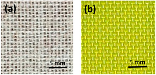 Plain woven fabrics of (a) jute and (b) aramid in Kevlar™.