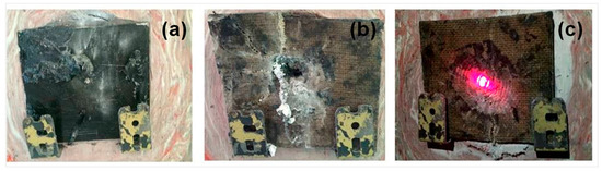 Typical aspect after ballistic test of multilayered armor system (MAS) targets with second layer of (a) 10 vol %, (b) 20 vol % and (c) 30 vol % jute fabric-reinforced polyester composite.