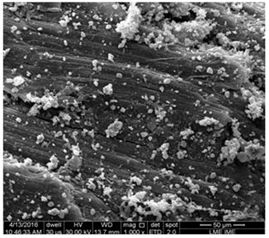 The results of depth of indentation in Table 1 are, within the standard deviation, practically equal. Although surprising, similar results were also found for other natural fiber/fabric [28,29,30,31,32,33,34] and Kevlar™ as second layer of MAS with the same dimensions, as the schematic displayed in Figure 2. The reason for this similar ballistic performance is the ability of the second layer, in a MAS with front ceramic, to collect fragments generated from the ballistic impact [35]. This ability does not require stronger fibers but mechanisms of mechanical incrustation as well as fragment attraction by Van der Waals forces and static charges on the fiber surface, of either synthetic Kevlar™ [35] or natural fabric [32,33]. Figure 6 shows the SEM fractograph illustrating the mechanism of fragments (white particles) capture by the 30 vol % jute fabric-reinforced polyester composite as MAS second layer.