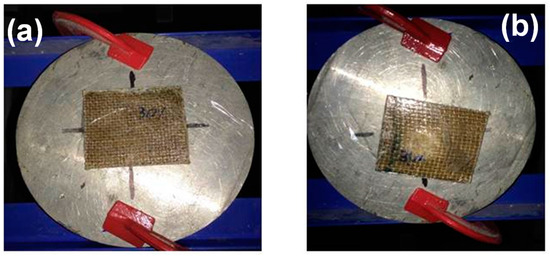 The composites investigated as MAS second layers, Figure 2, were composed of jute or aramid plain woven fabrics, illustrated in Figure 3. The jute fabric, Figure 3a, with areal density of 345 g/m2, was supplied by Lealtex, Rio de Janeiro, Brazil. The aramid fabric, composing a model S745 Kevlar™, Figure 3b, with areal density of 460 g/m2, was acquired from LFJ Blindagens, São Paulo, Brazil. Kevlar™ laminates consists of 16 plies of aramid fabric bonded with 5 wt % of polychloroprene.