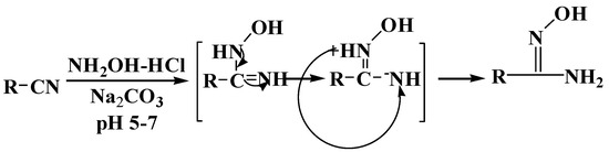 (2) Amidoxime-functionalized β-cyclodextrin-graft-(maleic anhydride-co-acrylonitrule) copolymer were also prepared by the above method using hydroxylamine, which was termed as β-CD-g-(MAH-co-AO) in this work. Rreaction scheme of the preparation of introducing amidoxime group is outlined in Figure 2. First of all, 7 g NH2OH·HCl was dissolved in an flask containing 100 mL solution of the mixture of methanol and water (v:v = 1:1). Next, 2.5 g of the β-CD-g-(MAH-co-AN) was added slowly into the solution under magnetic stirring at room temperature and then purged with nitrogen to remove the oxygen. Then the pH value was adjusted by Na2CO3 to 5–6. After that the system was heated to 70 °C for 6 h. The products were washed with deionized water and dried at 40 °C for further adsorption experiments.