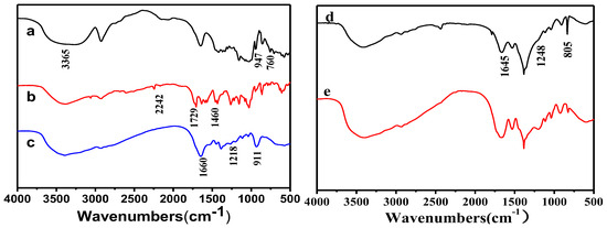 FT-IR spectra of β-CD (a); β-CD-g-(MAH-co-AN) (b); β-CD-g-(MAH-co-AO) (c); β-CD-g-(MAH-co-AO) adsorption of U(VI) (d); β-CD-g-(MAH-co-AO) desorption of U(VI) (e).