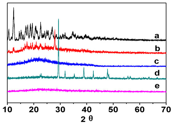 The XRD patterns of β-CD (a); β-CD-g-(MAH-co-AN) (b); β-CD-g-(MAH-co-AO) (c); β-CD-g-(MAH-co-AO) adsorption of U(VI) (d); β-CD-g-(MAH-co-AO) desorption of U(VI) (e).