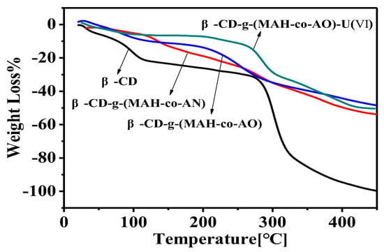The TGA curves of β-CD; β-CD-g-(MAH-co-AN); β-CD-g-(MAH-co-AO); β-CD-g-(MAH-co-AO) adsorption of U(VI).