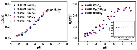 Figure 8 shows the effect of solution pH and ionic strength on U(VI) adsorption capacity onto β-CD-g-(MAH-co-AO). The adsorption of U(VI) on β-CD-g-(MAH-co-AO) was strongly dependent on pH and positive ions in the following order: K+ > Mg2+ > Na+, however, the presence of different concentrations of Na+ and negative ions (i.e. ClO4−, Cl− and NO3− ions) increases the ionic strength of the solution without affecting the efficiency of uranium adsorption. This is related to the valence state of the electrolyte ions and the hydrated ionic radius of mental ions [31,32]. According to the literature, the Na+ ion (0.178 nm) has a smaller hydrated ionic radius than the K+ ion (0.201 nm) [33], with smaller hydrated ionic radius of Na+ ions are more likely to spread to the surface of the adsorbent, and easier to enter the cavity of β-cyclodextrin on copolymer. So Na+ will occupy more of the adsorption sites on the adsorbent. However, K+ ions with larger hydrated ion radius can lead to rapid saturation of adsorption sites.