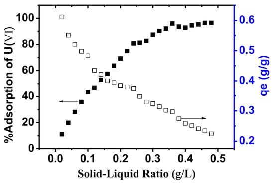 The adsorption percentage of uranium increases along with the solid-liquid ratio increases, this is because the increase of the adsorbent brought more adsorption sites for U(VI) at the same U(VI) concentration in solution. The adsorption percentage of uranium increases until the absorption process approachto equilibrium phase. On the contrary, the decreasing curve of adsorption capacity was shown in Figure 9. This is due to U(VI) occupy almost all the adsorption sites on the adsorbent at the low solid solution, which correlate with high adsorption capacity on unit adsorbent. However, the adsorption capacity on unit adsorbent decreases, due to the competition of the adsorbent at high solid-liquid ration. In order to study the influence of different factors on adsorption, the solid-liquid ratio in semi-adsorption was selected for subsequent experiments.