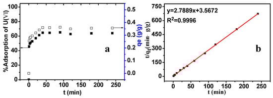 Effect of the contact time on the adsorption of U (VI) onto β-CD-g-(MAH-co-AO) (a) and the pseudo-second-order adsorption kinetics plot for U (VI) (b). ([U(VI)]0 = 4.1240 × 10−4 M, pH = 4.00 ± 0.05, T = 298.15 ± 1.00 K, I = 0.50 M NaNO3, m/V = 0.20 g/L).