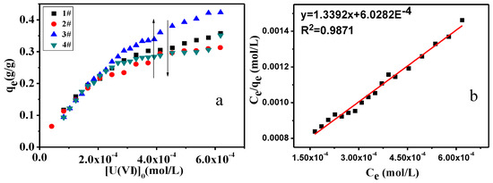 3.2.4. Effect of Initial U(VI) Concentration and Adsorption Isotherm