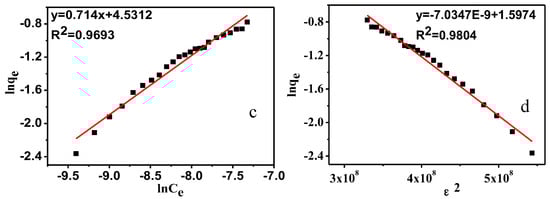 Effect of the initial U(VI) concentration on the adsorption of U(VI) onto β-CD-g-(MAH-co-AO) (a), and Langmuir model (b) Freundlich model (c) and D-R model (d) (Conditions: pH = 4.00 ± 0.05, I = 0.50 M NaNO3, t = 4 h, m/V = 0.20 g/L).