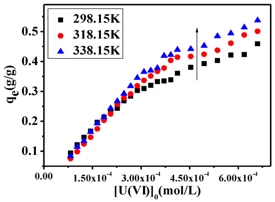 Figure 11 clearly shows that the uranium adsorption capacity by the β-CD-g-(MAH-co-AO) with several AO ratios at different uranium concentration. The adsorption capacity of the adsorbents increases firstly and then decreases while the ratio of AO increased (sample #1 to #4), meanwhile, the amount of adsorption U(VI) ions increases with increasing concentration of uranium. These results are shown that AO group plays an important role for adsorption uranium [37]. In addition, the results also be explained by the fact that the number of crosslinks increases with rising the ration of AO, enabling the formation of network structure provide more adsorption sites makes it possible for more uranium ions to enter the adsorbent’s network. However, with further increase of the AO, the degree of crosslinking increases has made the whole network becomes much compact is evidently unfavorable for the adsorption [8,17]. On all these counts, the adsorption capacity of U(VI) ion onto β-CD-g-(MAH-co-AO) depends on the ratio of three monomer, the optimal adsorption capacity can be achieved only if the ratio of three monomers are suitable and play roles at the same time.