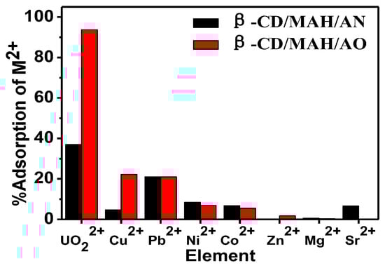 Based on the presence of other metal ions in seawater, it is necessary for adsorbents to have high selectivity for uranium. As shown in Figure 13, the adsorbents exhibited good adsorption selectivity for U(VI) rather than other elements mentioned above. The U(VI) was believed to coordinate with the amidoxime groups of β-CD-g-(MAH-co-AO) with specific proportions. Meanwhile, the average U–N bond distances are significantly shorter than the corresponding distances in other metal-nitrogen cations leading to a strong tendency of nitrogen-containing functional groups toward U(VI) ions. In addition, adsorbents also have a certain adsorption to copper and lead, the higher adsorption capacity for Cu(II) and Pb(II) should be related with the electron structure and the hydrated ionic radius [8]. The hydrated species of Cu(II) and Pb(II) showed the smaller ionic size facilitates the metal ion complexes with amidoxime groups [7,46].
