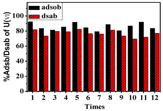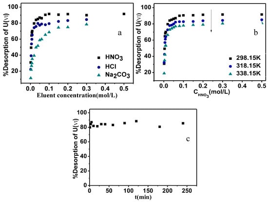 The dependence of U(VI) desorption on eluent concentration, temperature, and contact time was investigated. As shown in Figure 14, diluted HNO3 is very effective regenerate for copolymer adsorbent, on account of the adsorption process is mainly chelating mechanism while the process is very sensitive to pH. Meanwhile, the free electron doublet of nitrogen on amine groups is known to be responsible for the adsorption of U(VI) [21]. In addition, the 0.10 M HNO3 showed a better performance in the desorption of uranium, indicated that the electrostatic attraction and chelated attraction will give a major push to U(VI) adsorption onto β-CD-g-(MAH-co-AO) [47]. Furthermore, the desorption process of U(IV) onto β-CD-g-(MAH-co-AO) is exothermic, according to the trend analysis that the desorption of U(VI) decreases with increasing temperature. Desorption is a fast process that is beneficial to reducing the cost of uranium extraction. The optimal desorption conditions were selected 0.10 M HNO3 as the desorption agent for subsequent repeated use experiments.