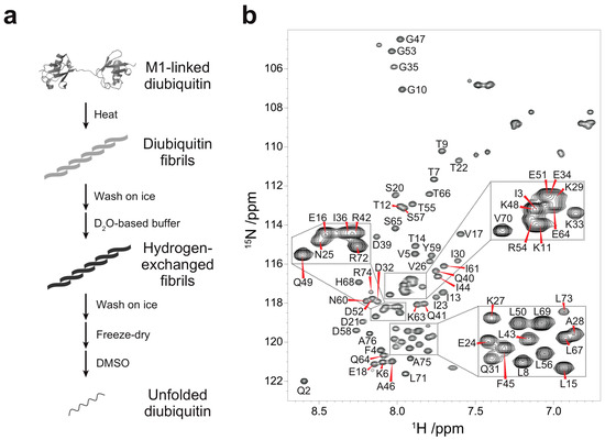 Quenched hydrogen-deuterium (HD) exchange experiments on M1-linked diubiquitin fibrils: (a) Strategy for the HD exchange experiments on M1-linked diubiquitin fibrils in dimethyl sulfoxide (DMSO). The M1-linked diubiquitin fibrils were formed by heat treatment, subsequently separated from residual native diubiquitin by centrifugation, and washed with ice-cold D2O-based buffer. The purified fibrils were suspended in the D2O-based buffer and incubated for 24 h. After the HD exchange, the fibrils were purified, freeze-dried, and dissolved in d6-DMSO containing 0.026% (v/v) d1-trifluoroacetic acid (TFA); (b) Assigned 1H-15N spectrum of the monoubiquitin G75A/G76A mutant in d6-DMSO containing 0.026% (v/v) d1-TFA.
