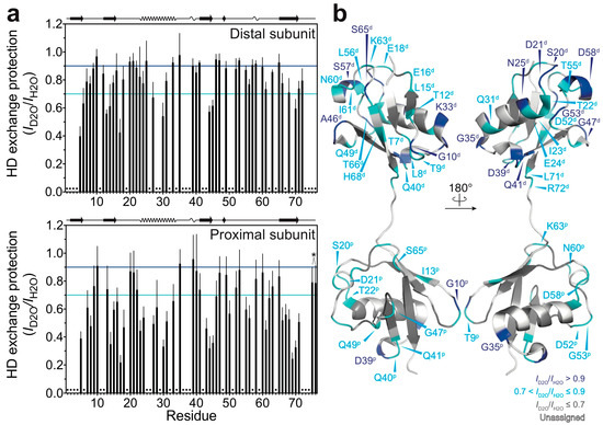 Furthermore, we found that the relatively solvent-protected residues are located in loop regions and at edges of secondary elements of the native structure of M1-linked diubiquitin (Figure 2b: residues colored in blue and cyan). In particular, the amide protons of G10, G35, and D39 (located in the loop between the β-strands β1 and β2, the edge of the α-helix, and the first 310-helix in the native structure, respectively) were highly solvent-protected in both ubiquitin subunits in the structure of the fibrils. In the distal subunit, S20 and D21 (located in the loop between the β-strand β2 and the α-helix), N25 and K33 (the edges of the α-helix), Q41 (first residue of the β-strand β3), A46 and G47 (loop between β3 and β4), G53 (turn between the β-strand β4 and the second 310-helix), S57 and D58 (the second 310-helix) were also highly solvent-protected in the diubiquitin fibrils (note that parentheses indicate the secondary structure in natively folded diubiquitin).