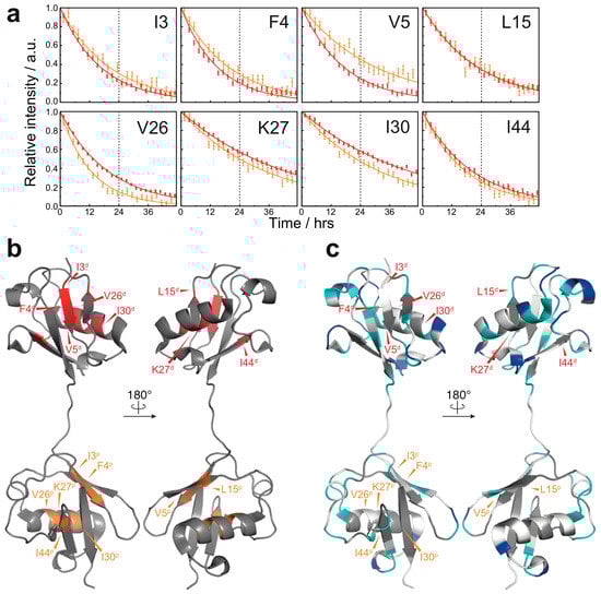 By contrast, most of the amide protons in natively folded diubiquitin were completely exchanged to deuterium within 24 h. This suggests that the overall solvent-accessibility was drastically reduced owing to fibril formation. Hydrogen exchange of several residues (I3, F4, V5, L15, V26, K27, I30, and I44) of natively folded diubiquitin, however, continued past 24 h (Figure 3a,b). Although a few residues (I3, F4, and V26 of both subunits) had to be excluded from the analysis due to peak overlap, for the majority of the residues (K27 and I30 of the distal subunit; V5, K27, and I44 of the proximal subunit), the estimated HD exchange protection values were comparable between the native state and the fibrils (Figure S3 in the Supplementary Materials). This result suggests that the structure of native ubiquitin can partially remain intact in the diubiquitin fibrils. Compared to diubiquitin fibrils, however, several residues (V5, L15, and I44 of the distal subunit; L15 of the proximal subunit) were less solvent-protected in the native state (Figure S3 in the Supplementary Materials); in addition, I30 of the proximal subunit was more solvent-protected in the native state (Figure S3 in the Supplementary Materials). Thus, the change in solvent-accessibility of these particular residues may arise from a more complicated structural rearrangement in the course of fibril formation. Taken together, in the formation of fibrils, inter-molecular interactions via many residues are formed presumably due to a combination of hydrogen bonds, electrostatic, and hydrophobic interactions. In contrast, the diubiquitin fibrils may also retain a part of the native structure of ubiquitin, which might enable binding by recognizing proteins.