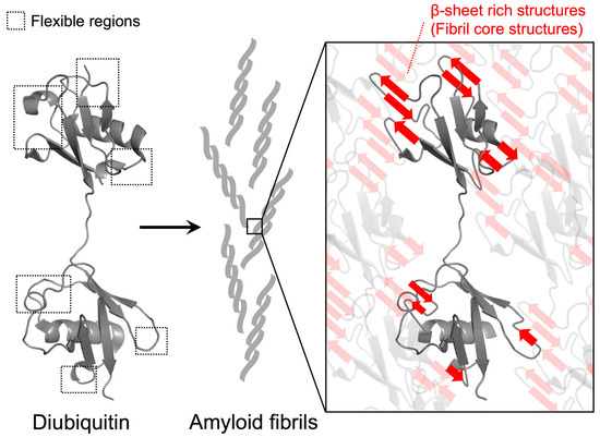 HD exchange experiments allow the identification of solvent-protected backbone amide protons. Here, the observed HD exchange protection profiles suggest that polyubiquitin fibrils are formed by the association between intrinsically flexible regions rather than by drastic rearrangements of secondary structure elements (Figure 2b). Because we previously observed that polyubiquitin fibrils can be recognized by ubiquitin-adaptor proteins such as p62 and NBR1, the hydrophobic surface centered on I44 for ubiquitin recognition may remain intact in the fibrils and thus stay exposed to solvent similar to native ubiquitin [21,22]. This is consistent with the observation that the HD exchange protection of polyubiquitin fibrils was not particularly pronounced in the I44-centered hydrophobic surface (Figure 2 and Figure 3c); rather, these exchange rates were comparable to the native state (Figure S3 in the Supplementary Materials). In addition, unlike intrinsically disordered amyloid-prone proteins such as amyloid β and α-synuclein, natively folded amyloid-forming proteins including β2-microglobulin and superoxide dismutase 1 (SOD1) have more complex fibril formation pathways [23]. In the amyloid formation of folded proteins, partial structural rearrangements and/or conversion of intrinsically flexible structures to β-sheet structures can initiate oligomerization and fibril formation. In particular, the flexible loops of SOD1 play an essential role in the structures of the oligomeric states and fibrils [24]. This analogy to SOD1 may illustrate why in polyubiquitin fibrils, intrinsically flexible regions were found to be highly solvent-protected (Figure 2b and Figure 4).
