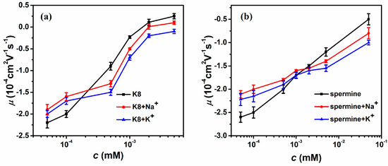 After the crossing point, the scenario is switched to the opposite side. When the concentration of K8 is more than about 0.0002 mM, the DNA mobility shifts to a small value after mixing sodium or potassium ions in solution. The DNA charge compensation is suppressed by adding monovalent cations. It resumes to the case of normal ionic strength (>0.0064 for K8) we explored before [10,21,48]. For example, when the concentration of K8 is 0.0001 mM, the value of μ was −2 (in units of 10−4 cm2 V−1 s−1, the same unit is assumed for mobility in the following unless otherwise stated). When the monovalent ion (3 mM) was added to K8-DNA solution, the value of μ climbed slightly up to −1.6 (Na+) and −1.7 (K+), respectively. We can see that the change of DNA electrophoresis mobility by adding Na+ is slightly bigger than K+, implying that the effect of charge neutralization promotion by sodium ion is more obvious. After crossing the critical concentration of K8, the promotion becomes some suppressive. More specifically, when K8 is present alone in solution and its concentration is 0.0005 mM, the value of μ is −0.9. When the monovalent ion (3 mM) was added to K8-DNA solution, the value of μ descends to −1.3 (NaCl) and −1.5 (KCl), respectively. Similarly, we can see that the change of DNA electrophoresis mobility by adding K+ is more significant in the case of Na+, corresponding to more obvious suppression of charge neutralization. The result is also valid for the other multivalent counterion spermine. Figure 2b shows the DNA electrophoresis mobility with 1 mM TRIS buffer containing spermine with or without mixing with sodium chloride or potassium chloride in solution. In the same way, the mobility of DNA goes up with increasing spermine concentration. There is also a crossing concentration of spermine of 0.001 mM. Before the crossing value, the DNA mobility shifts to a less negative after mixing sodium or potassium ions in solution. After the crossing concentration, the suppression of charge neutralization can be observed when sodium chloride or potassium chloride were added to the spermine-DNA solution.
