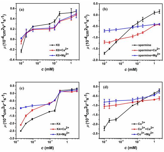 Electrophoretic mobility μ of condensed DNA as a function of the multivalent ions containing di-valent ions (3 mM Ca2+, 3 mM Mg2+) in 1 mM TRIS. (a) The EM as a function of K8, K8-Ca2+, K8-Mg2+. (b) The EM as a function of spermine, spermine-Ca2+, spermine-Mg2+. (c) The EM as a function of K4, K4-Ca2+, K4-Mg2+. (d) The EM as a function of Cobalt hexamine, Cobalt hexamine-Ca2+, Cobalt hexamine-Mg2+. Each data point is the average of three consecutive measurements with the corresponding standard deviation as the error.