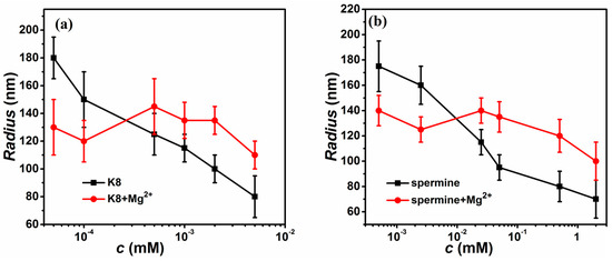 The hydrodynamic radius of condensed DNA as a function of the multivalent ions in a buffer containing di-valent ions (3 mM Mg2+). (a) The data for K8, K8-Mg2+ solution (black, red). (b) The data for spermine, spermine-Mg2+ solution (black, red).