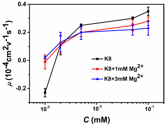 The concentration of mono- or di-valent counterions might influence the variation of electrophoretic mobility and DNA compaction. We did a control experiment by lowering Mg2+ concentration to 1 mM in K8 solution. The comparison of electrophoresis mobility is shown in Figure 5, which is very similar to the case of 3 mM di-valent counterions but with a slightly weaker effect.