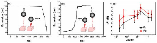 DNA compaction causes a rapid step-like decrease in its extension when magnetic force (F) decreases below the condensation force, Fc. In general, this shrinkage of DNA length is thought to be initiated by the spontaneous nucleation of a loop in the DNA [36]. Figure 6 presents typical extension-time curves of DNA compaction induced by K4, in which (a) shows a condensing curve while (b) denotes a unraveling curve of DNA. The condensing force and unravelling curves are shown in Figure 6c with increasing K4 concentration. From the black curve of Fc, we can see that the condensing force initially increases rapidly and then reaches its maximal value around 0.2 mM K4 concentration, and finally decreases. The peak of force usually corresponds to the state of DNA with most neutralized charge since the electrostatic repulsive force is minimized in the state. When the concentration of K4 goes up further, the DNA charge might be over-compensated, resulting in the decrease of condensing force because of the regained Columbic repulsion between segments of DNA [51]. The red curve of unraveling force FU in Figure 6c shows the same trend as the condensing force Fc but its value is bigger than Fc at the corresponding concentration of K4. It is understandable, since the unraveling process might involve the overlapping of different segments of DNA after condensation. In general, the maximal condensing or unraveling force corresponds to the complete neutralization of DNA charge, both under- or over-compensation of charge results in the decreasing force due to the charge depending Columbic repulsion.