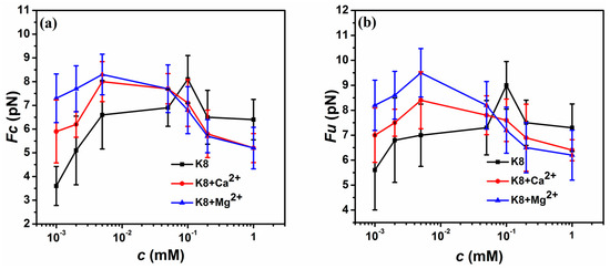 Figure 7 shows measurements of the condensation force, FC and unraveling force FU as a function of the K8 concentration with mixing different di-valent cations. The black curve in Figure 7a exhibits an increase in FC with increasing K8 concentration up to a maximum at about c = 0.1 mM, followed by a gradual decrease of FC with further increasing concentration of K8. The red curve in Figure 7a denotes FC as a function of K8 concentration when mixing 3 mM CaCl2 in solution, which shows the same trend as the case of only K8 in solution. The difference between them can be noted in the region of low K8 concentration, where FC of tethering DNA is promoted in the presence of CaCl2 in solution. It means that the charge compensation of DNA by multivalent counterion is promoted when adding extra di-valent counterions in the region. This phenomenon is quite different from the case we have observed at mild spermine concentration (>0.4 mM) [42]. The blue curve in Figure 7a denotes FC as a function of the K8 concentration when 3 mM MgCl2 is added in the solution. It shows a similar trend to the condensing force curve of CaCl2, but with bigger condensing force at the region of very low concentration of K8. From the whole interval, we can see that magnesium ions show more significant promotion effects, but the suppression effect has a little difference and it is difficult to distinguish between MgCl2 and CaCl2. Figure 7b denotes FU as a function of the K8 concentration in different di-valent cations. The unraveling curves show the same trend with FC but with a bigger value at its corresponding concentration. In the unraveling procedure, we can see more obvious promotion and suppression effect. In the same way, MgCl2 solution shows more significant influence on the promotion effect compared with CaCl2, and the suppression effect has a little difference.