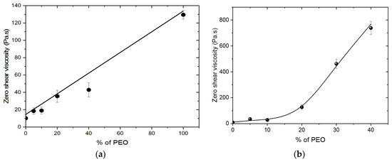 Zero shear viscosity at 20 °C for solutions prepared for films and fibers production as a function of w/w % of PEO in the blend. T = 20 °C. (a) By mixing 5% solutions of chitosan and 5% solution PEO in 0.5 M acetic acid; (b) by addition of powder PEO in 5% chitosan solution.