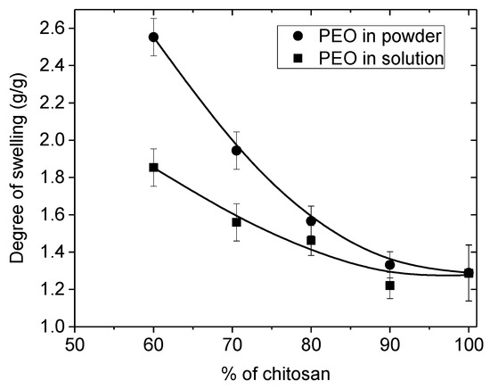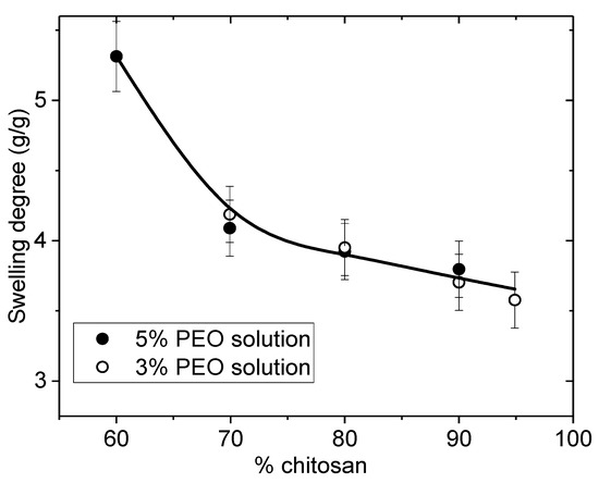 Degree of swelling of nanofiber mats after extraction of PEO (MW = 5 × 106) and rehydration as a function of the initial chitosan content w/w % in the initial blend.