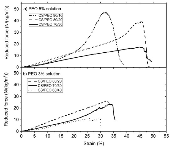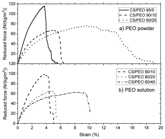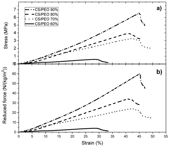 (a) Stress under uniaxial traction σ (expressed in MPa) and (b) Reduced force (expressed in N/(kg/m2)) on films under rehydrated form (wet state) after chitosan neutralization, PEO (under powder form) extraction and drying. PEO MW = 1 × 106.