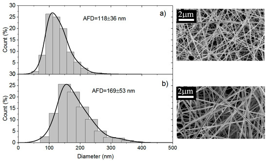 In addition, the diameters of the fibers are lower for 70% chitosan when PEO is added as 5% PEO solution (MW = 1 × 106) (Figure 9a) compared with PEO (MW = 5 × 106) (see Figure 10a). This influence of MW was previously shown for cellulose acetate and poly(vinyl chloride) nanofibers [30]. SEM indicates that fibers are thinner with 3% solution than with 5% with also a broader distribution causing lower mechanical properties (Figure 10a,b). These results are directly related with the viscosity of the electrospun systems and consequently with the flow rate necessary to optimize the process.