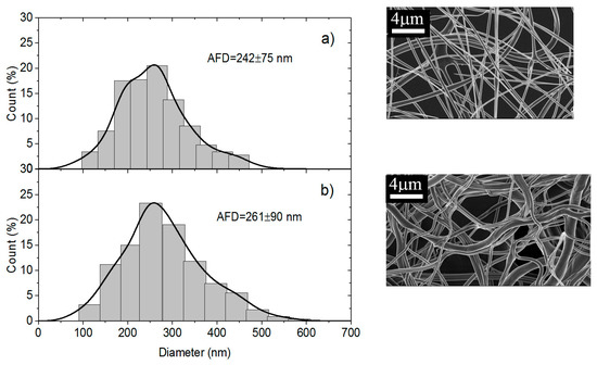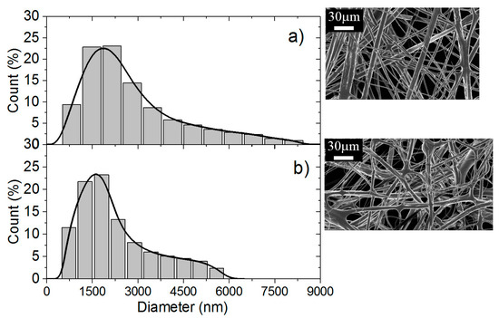 Comparison of Figure 11a,b indicates that washing does not modify the fiber morphology. Nevertheless, the distribution of diameters is a little broader than that obtained for 70/30 in presence of PEO MW = 1 × 106 but the use of PEO MW = 5 × 106 was necessary to get convenient conditions for electrospinning even if the viscosity was larger for the PEO solution.