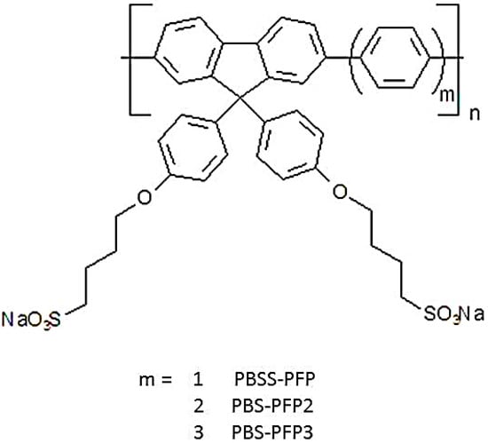 Structures of the fluorene-arylene conjugated polyelectrolytes studied.