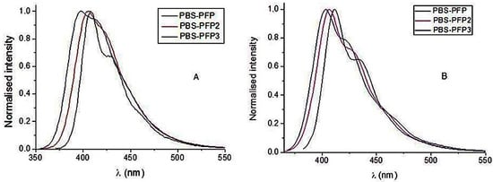 The amount of co-solvent needed to break up the clusters was found to increase in the order PBS-PFP < PBS-PFP2 < PBS-PFP3, reflecting increasing hydrophobicity and decreasing charge density on these hairy rod-type copolymers. For example, although 20% dioxane was sufficient to induce increases in fluorescence intensity with PBS-PFP [], indicating de-aggregation, with PBS-PFP2, 40% dioxane was necessary. However, the actual dependence on the mole fraction of co-solvent was complex, possibly as a result of the importance of selective solvation in these systems []. The bands in the fluorescence spectra all shifted to shorter wavelengths upon addition of co-solvent or surfactant, in agreement with the break-up of aggregates being an important factor in the solubilization [,]. However, the extent of this blue shift depends on the number of arylene rings, as seen by changes in the first emission maximum in 50% acetonitrile-water solutions, PBS-PFP (407 nm) > PBS-PFP2 (405 nm) > PBS-PFP3 (398 nm), and illustrated in Figure 2A. Similar behavior is observed in the presence of C12E5, although the emission wavelengths are somewhat longer (PBS-PFP (415 nm) > PBS-PFP2 (408 nm) > PBS-PFP3 (402 nm), and Figure 2B), possibly suggesting a very slight increase in conjugation in the surfactant system compared with 50% acetonitrile-water.