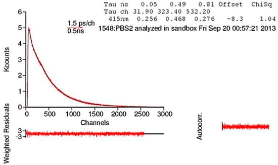 Fluorescence emission decay of PBS-PFP2 at 415 nm in a 1:1 MeOH/H2O solution fitted to the sum of three exponentials. Weighted residuals (W.R., scale −3 ≤ σ ≤ +3) and autocorrelation functions are also presented to show the quality of the fit.