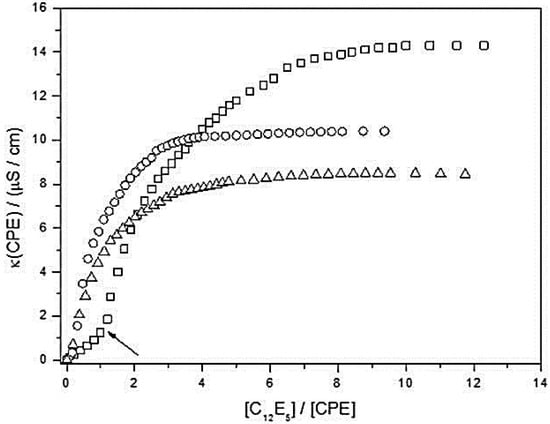 Changes in specific electrical conductance () of aqueous solutions of CPEs upon adding C12E5, at 25.0 °C. (□) PBS-PFP, (o) PBS-PFP2, and (∆) PBS-PFP3. The arrow highlights the cac for PBS-PFP:C12E15 mixed solutions.