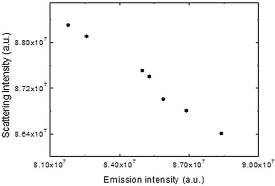 Plot of light scattering at 500 nm against fluorescence intensity at the emission maximum (415 nm) upon injecting a solution of PBS-PFP3 in 50% methanol-water into pure water.