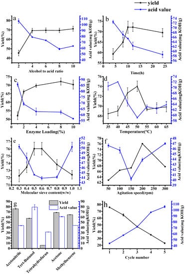 In this reaction, dimer acid and glycerol carbonate do not mix. Therefore, a suitable solvent should dissolve enough raw materials for the lipase-catalyzed esterification, and the solvent should not affect lipase activity and stability. The results show that the reaction had the lowest yield in tetrahydrofuran, which might have altered the native conformation of the lipase (Figure 2g). Tert-butanal and acetone led to high acid values because GC did not dissolve entirely, which would have led to inadequate participation in the reaction. However, acetonitrile did dissolve the DA and GC at 50 °C, and had a low effect on Novozym 435. Foremost, the yield had the highest value and the acid value was low enough in acetonitrile. Thus, acetonitrile was selected for use in subsequent experiments.
